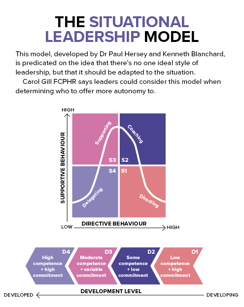 “The Situational Leadership Model, based on the contingency theory of leadership [see illustration], suggests if somebody is quite junior and new to a job, you have to give them a lot of intense direction. But if somebody is fully capable and highly motivated, you leave them alone.