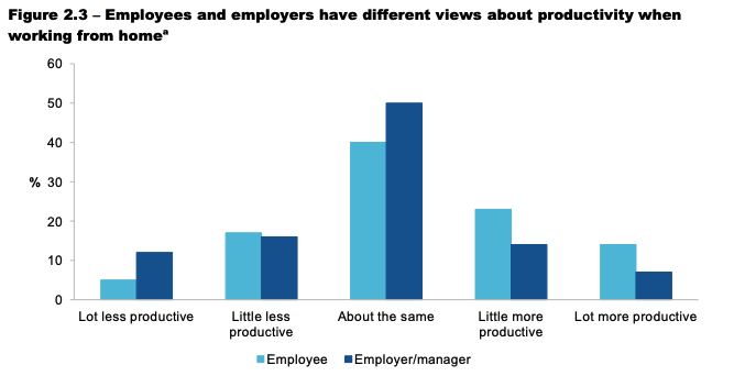 But even if we focus solely on the positive research, the Commission still found a discrepancy between employers’ and employees’ perception of productivity levels during remote work arrangements (see graph below). Employers were more likely to think productivity rates had dropped or stayed the same.